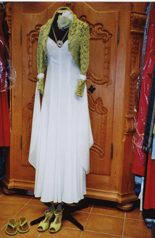 Brautkleid im Empire Stil aus Crepes du Chine. abnehmbare Fledermausärmel Bolero aus grüner Häkelspitze Farbig abgestimmte Accesioress |